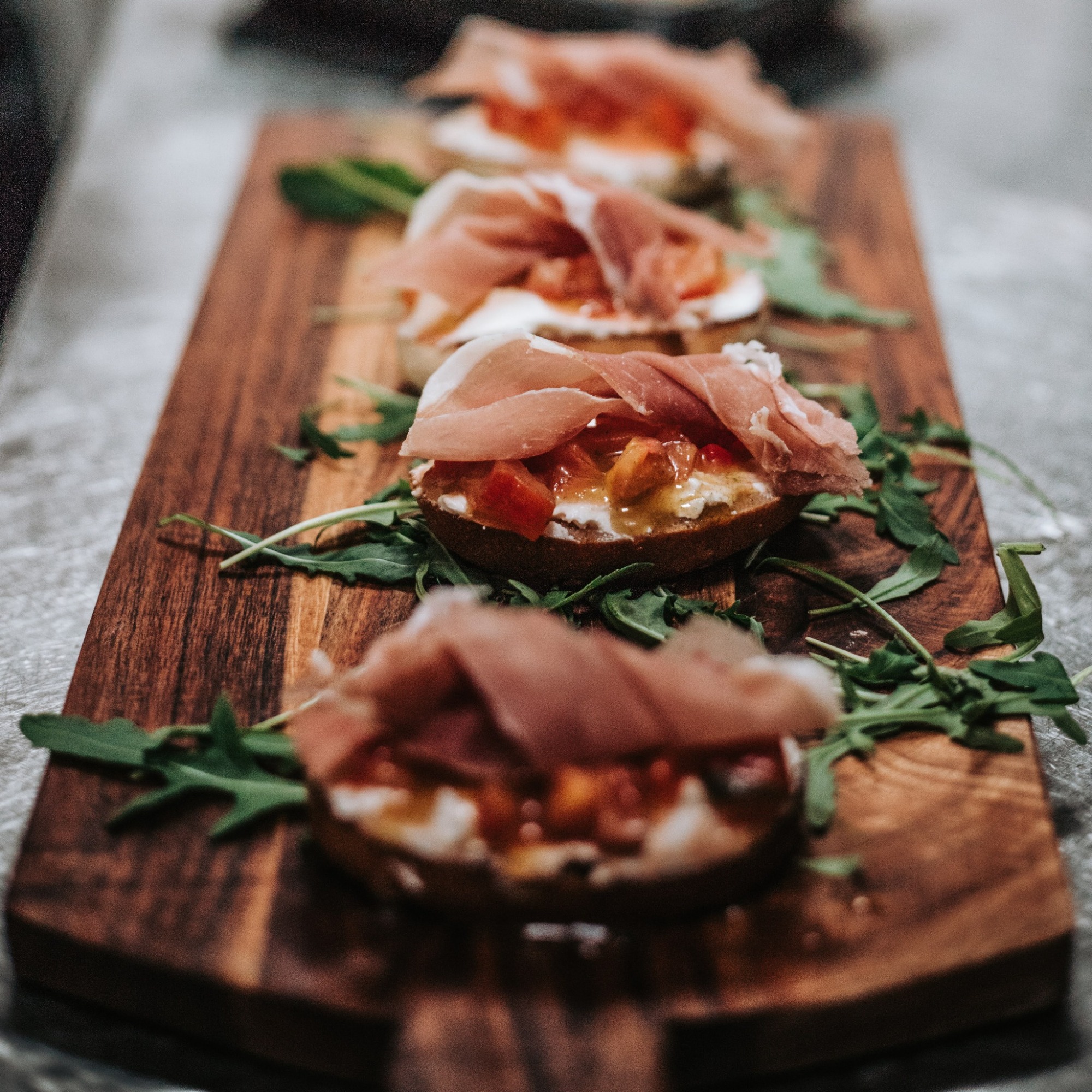 brushcete cu cremă de brânză, prosciutto crudo, roșii -