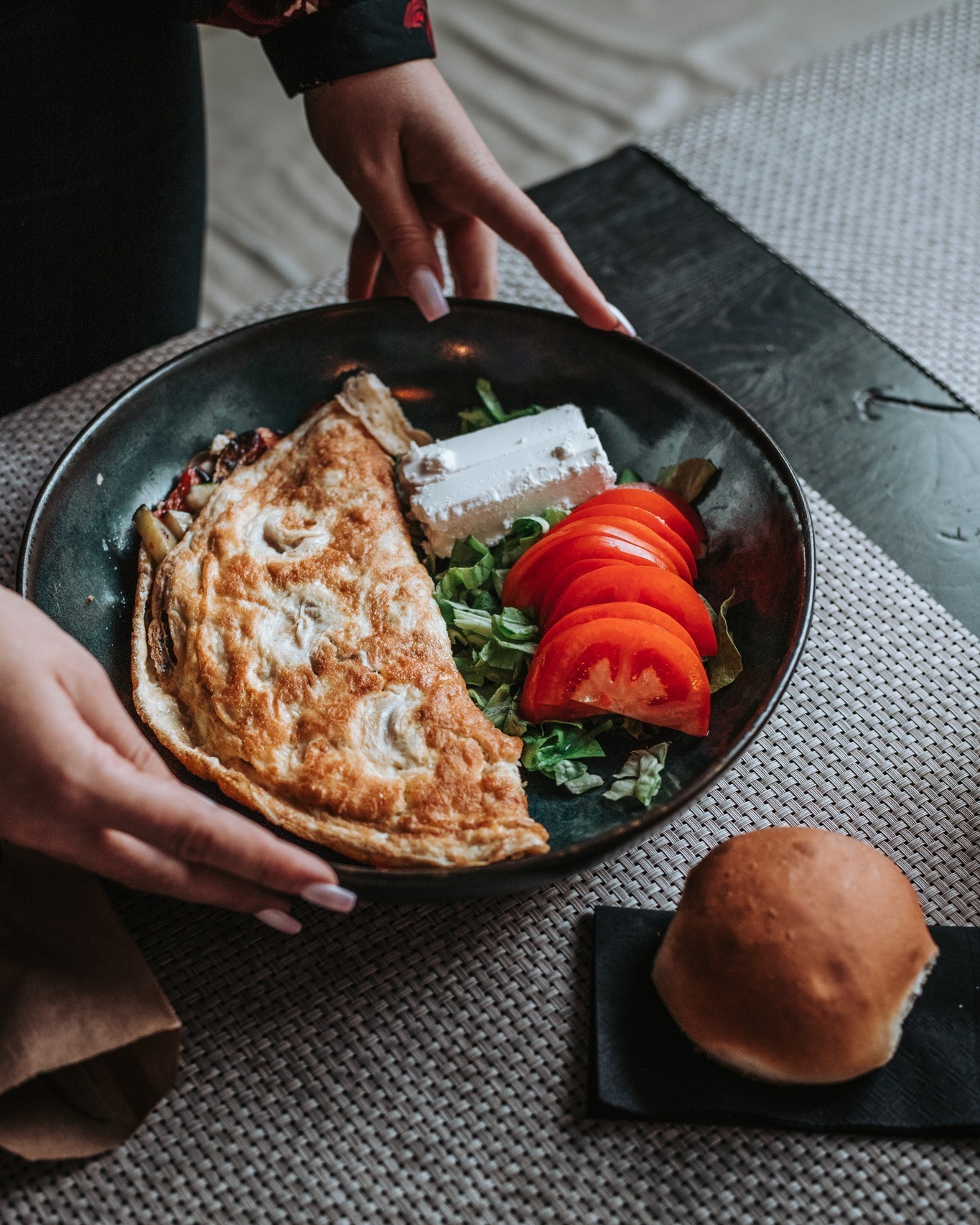 3 ouă, bacon sau șuncă, cașcaval, brânză feta, roșii și salată verde -