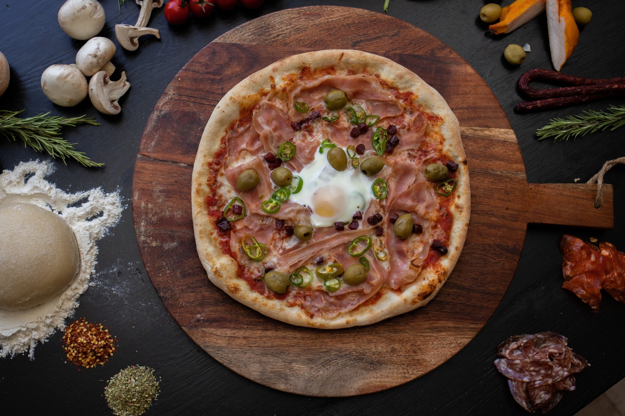 3 ouă ochiuri, bacon crocant, cașcaval, roșii cherry, ciuperci, ceapă roșie și ardei -